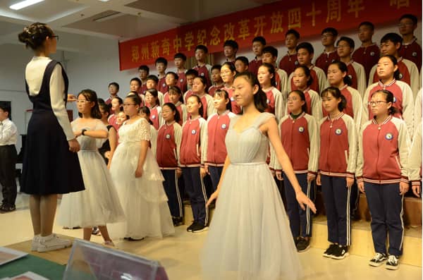 为纪念改革开放四十周年,激发同学们热爱祖国、积极奋进的热情,增强实现中华民族伟大复兴的使命感和责任感。10月30日,郑州新奇中学第四届八年级合唱比赛在阶梯教室正式拉开帷幕。我校初中部韩银才、程旭副校长,郑州市青年指挥何灏,郑州七中高中部郭松老师,我校杨森、董霄琦老师等担任评委,八年级全体师生参加了本次活动。 飞扬的歌声,吟唱难忘的岁月;熟悉的旋律,演绎时代的乐章。八年级的全体学生用大气磅礴的歌声和旋律、独具匠心的唱法和服饰,